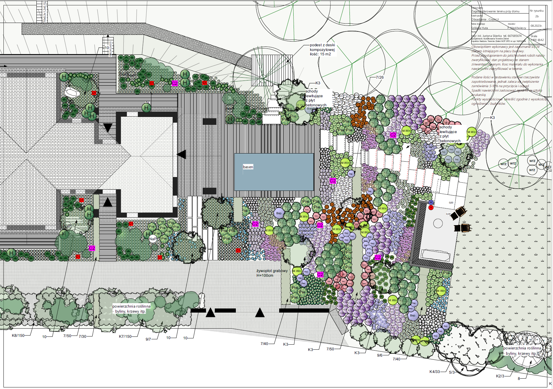 Na planie znajdują się zwymiarowane wszystkie rośliny – byliny i rośliny zielne w swoich docelowych rozmiarach, drzewa i krzewy – ok. 10 lenie okazy. Spis roślin z nazwami łacińskimi ułatwia zakup w szkółce roślin ozdobnych. Na planach uwzględniam rośliny znajdujące się w Twoim ogrodzie – istniejące.